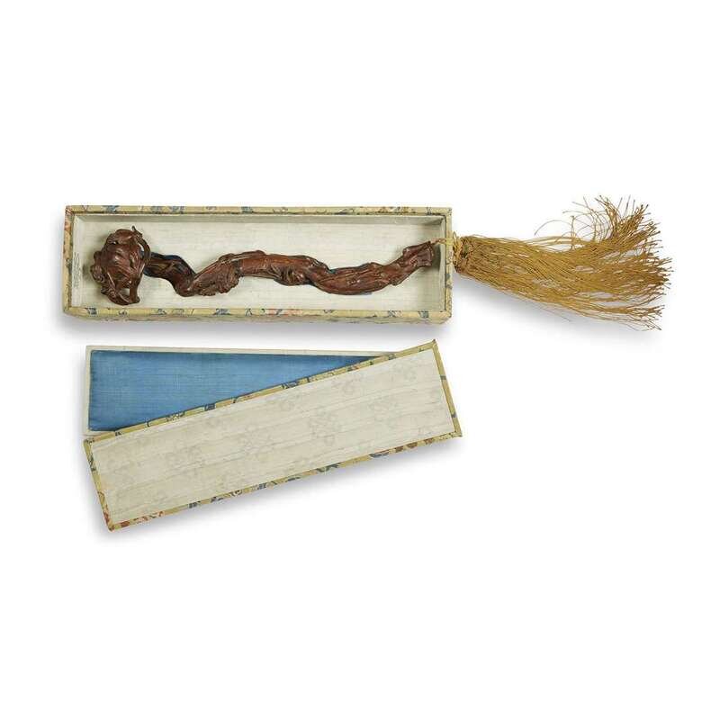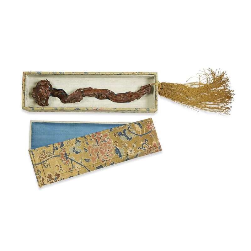 A Chinese carved wood Ruyi scepter, possibly chenxiangmu, with brocade-clad box qing dynasty