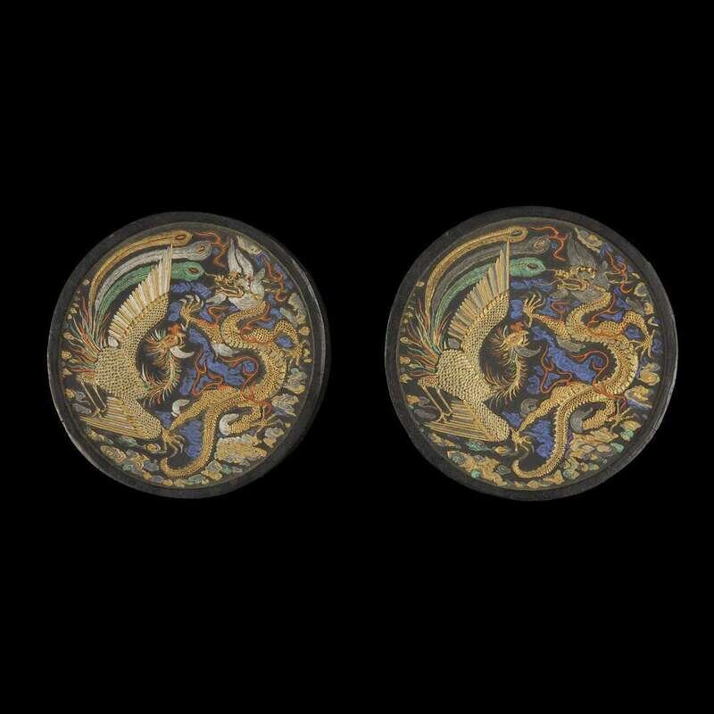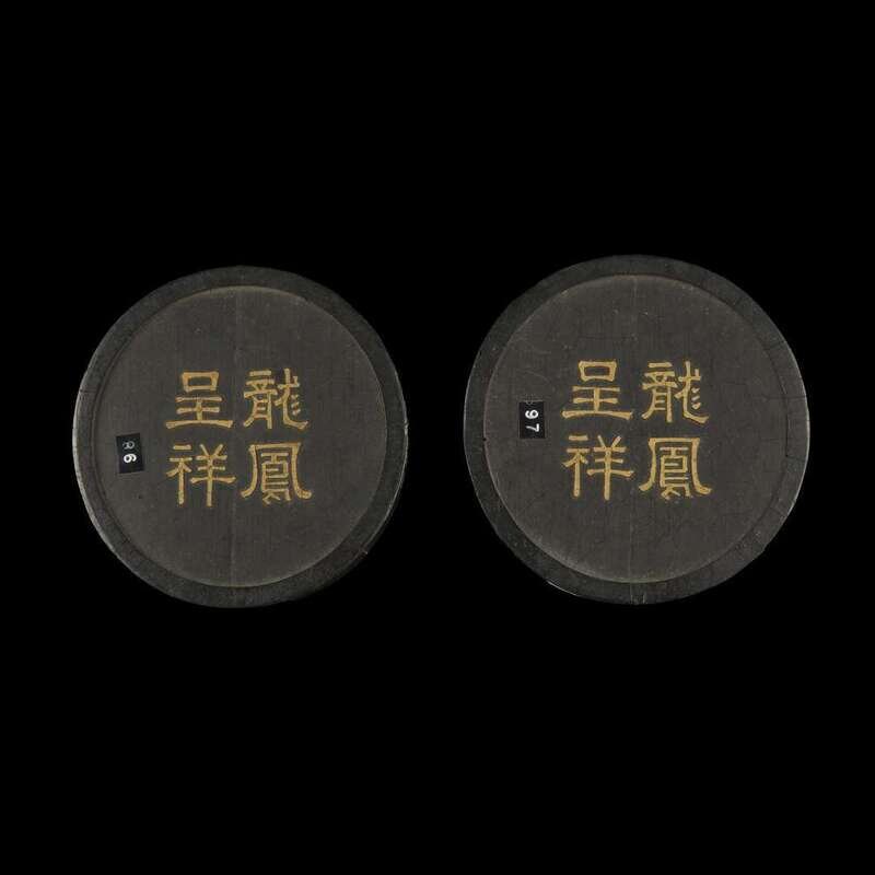 A pair of Chinese "Dragon and Phoenix" molded, colored, and parcel-gilt black ink cakes