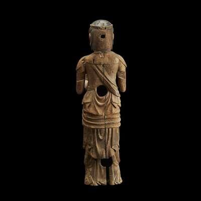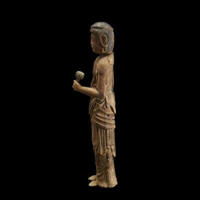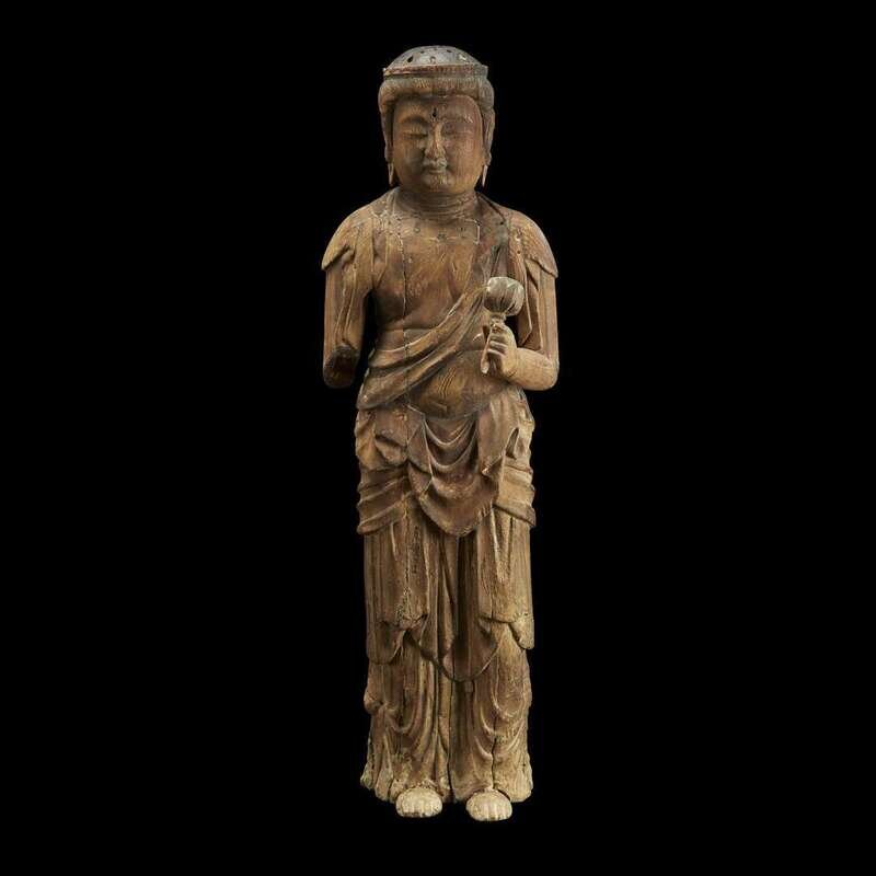 The standing figure with softly draped robes, the face with a serene expression, the left hand raised, bearing a lotus blossom.