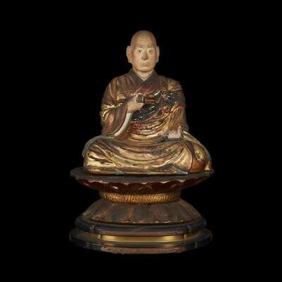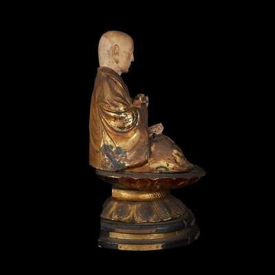 A Japanese carved, painted, lacquered and gilt wood figure of a seated Buddhist monk Late Edo/early Meiji period
