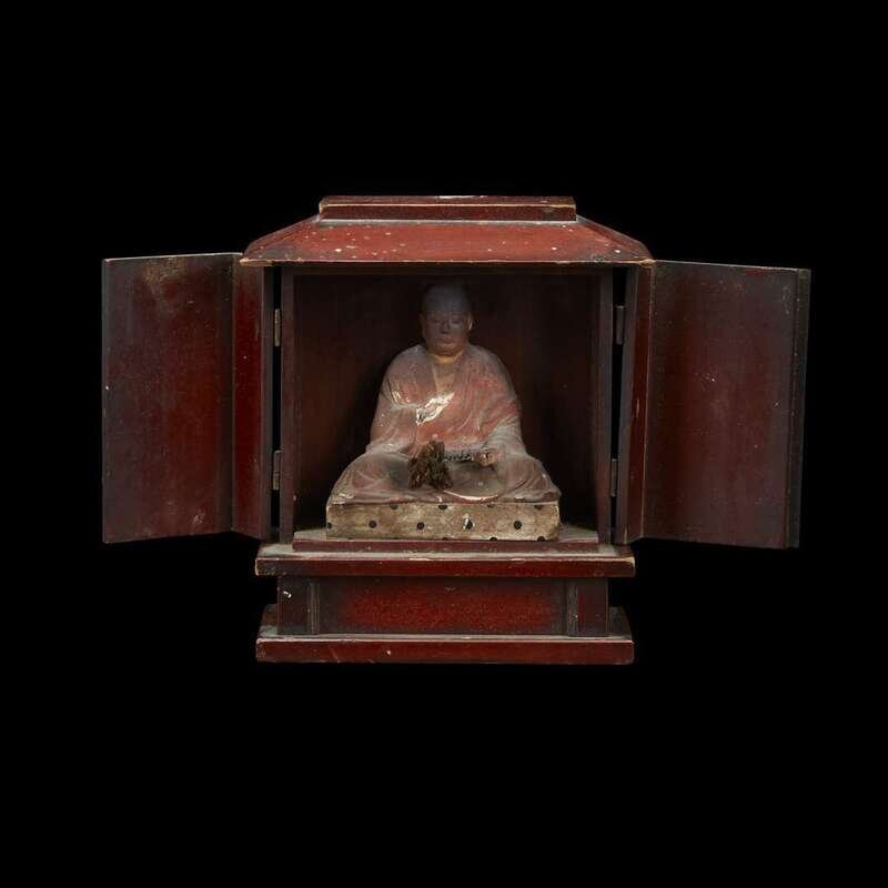 A Japanese red-lacquered Buddhist shrine, enclosing a monk Possibly late Edo period