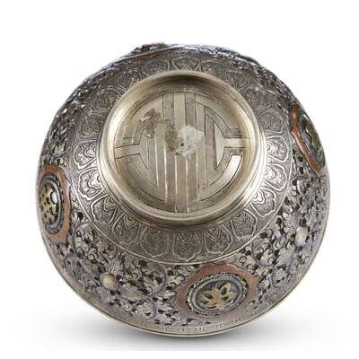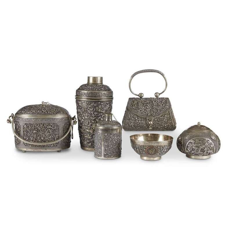 Group of six Chinese pierced and repousse silver vessels and boxes,