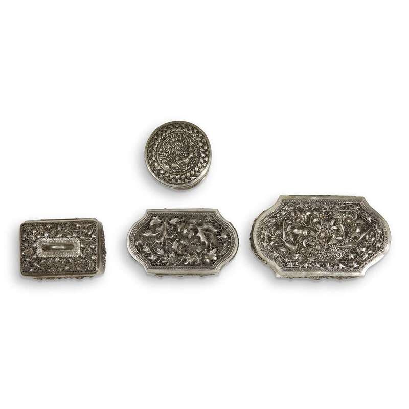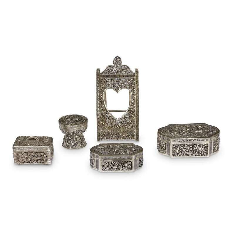 Group of four Chinese pierced and repousse silver boxes and one picture frame (5)