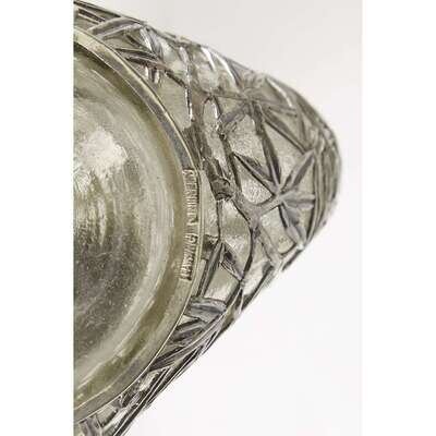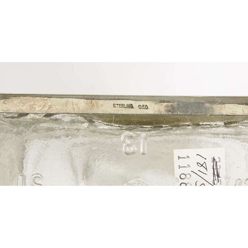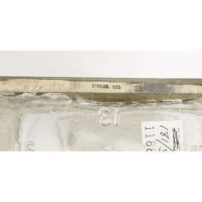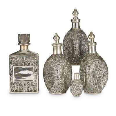 Comprising a set of three bamboo-pattern pinched decanters with stoppers, and a similar small bitters bottle (lacking stopper), all stamped "sterling" and "Taiping" to the base; together with a similar bamboo-pattern rectangular decanter and stopper, stamped "sterling 950" on underside.