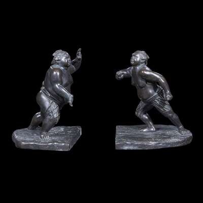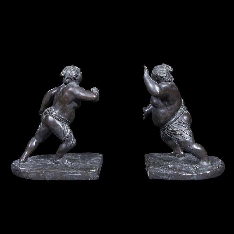 A pair of Japanese patinated bronze sumo wrestler bookends