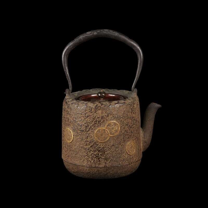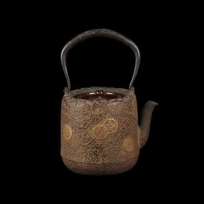 Japanese cast iron "coins" tetsubin with patinated bronze cover 19th/early 20th century