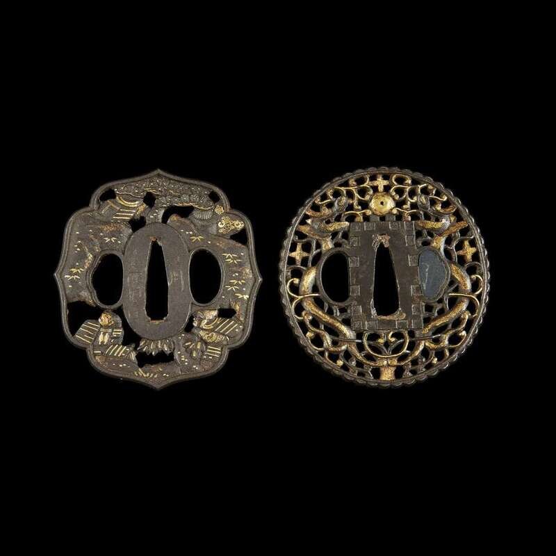The first modeled with samurai, both sides inscribed; the second with a pair of stylized dragon on scroll-ground, flanking an orb surmounted by a cross (possibly a reference to the Christian religion).