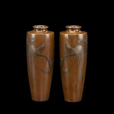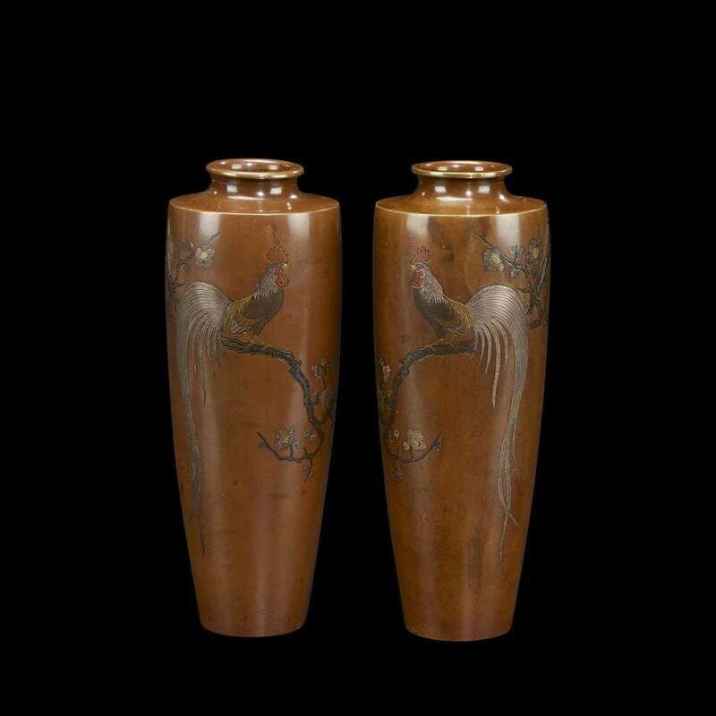 Pair of Japanese patinated bronze vases depicting cockerels, Nogowa, Kyoto, signed Shuguoku