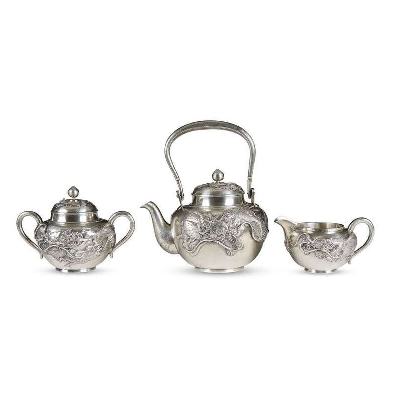 Retailed by H. E. Heacock Co., Manilla, Phillipines. Comprising a teapot, creamer, and a covered sugar, monogramed "F." Total weight approximately 29.6 oz t.