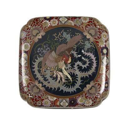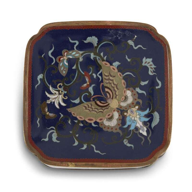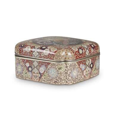 With lobed corners, the cover decorated with phoenix against an elaborate "brocade" ground, the sides with dense patterns of flowers and scrolls, butterflies to underside; the interior lined with silk brocade.