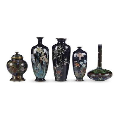 Comprising: a compressed bottle vase with green ginbari shoulder; a baluster jar and cover with floral roundels; a silver-wire "Lily and Chrysanthemum" vase; a silver-wire "Bird and Flowering Branches" vase; A Haiyashi Chuzo "Iris" vase (underside with stamped mark).