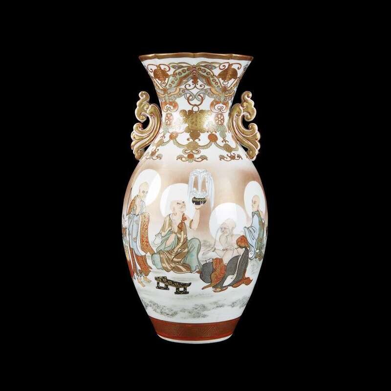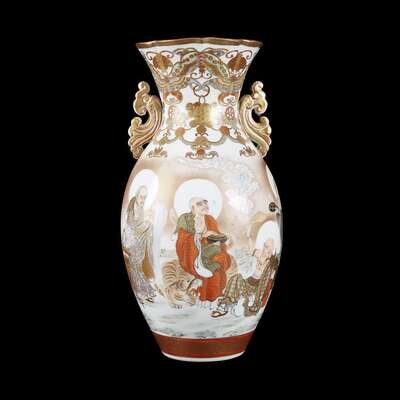 A finely-painted Kutani porcelain "Rakan" vase with scrolled handles