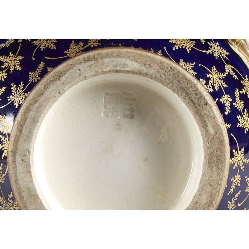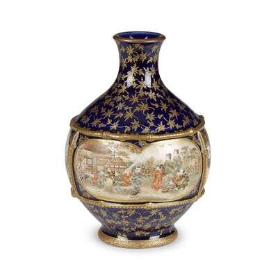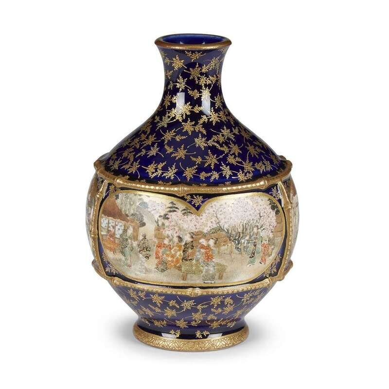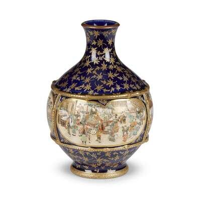 The exterior depicting three scenes of Japanese figures in landscapes, shoulder and base decorated with gold leaves on cobalt blue ground, underside with a stamped mark.