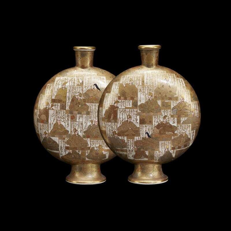 A pair of Satsuma pottery "moon flask" vases, decorated with poet cards