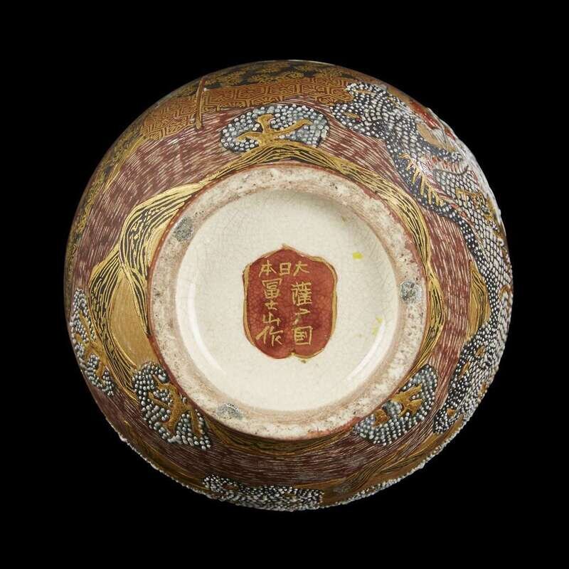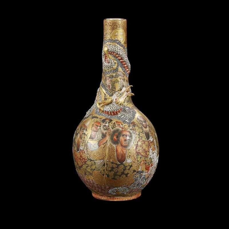 A Satsuma enameled pottery "Dragon and Rakan" small bottle vase