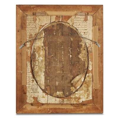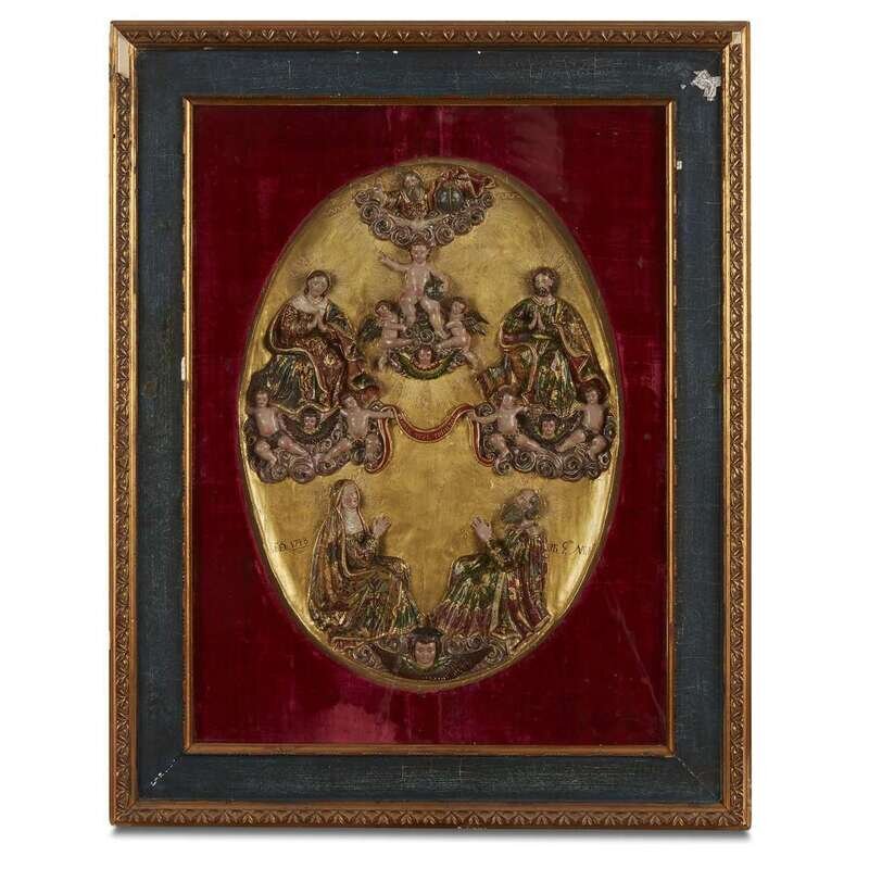 The oval panel depicting God the Father, Christ, and the Virgin above two donors, dated 1748 and inscribed "Gloria, Tibi, Trinitas," housed in a crimson velvet and giltwood frame.