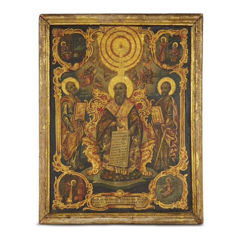 Depicting the saint enthroned beneath the all-seeing eye, surrounded by cherubim and angels and flanked by saints Peter and Paul, the whole within gilt baroque scrollwork with scenes from the life of the saint in corner roundels, the verso painted with Golgotha, cross, sponge, and spear, inscribed ICXC, NIKA, and dated 1733; housed in giltwood frame.