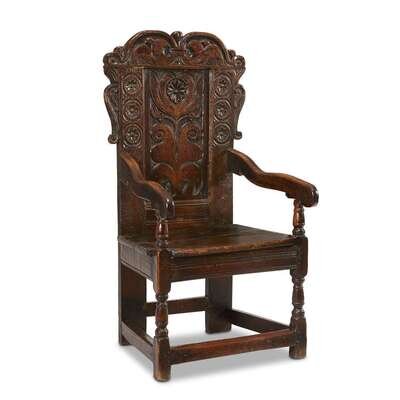 With shaped crestrail above straight paneled backrest carved with rosettes, volutes, and foliate scrolls, issuing two gently scrolling armrests; the paneled seat chip-carved to sides and raised on turned front legs and rear panel legs united by stretchers.