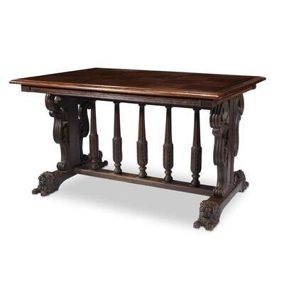 With rectangular parquetry top raised on boldly carved H-form stand and four lion-form feet.