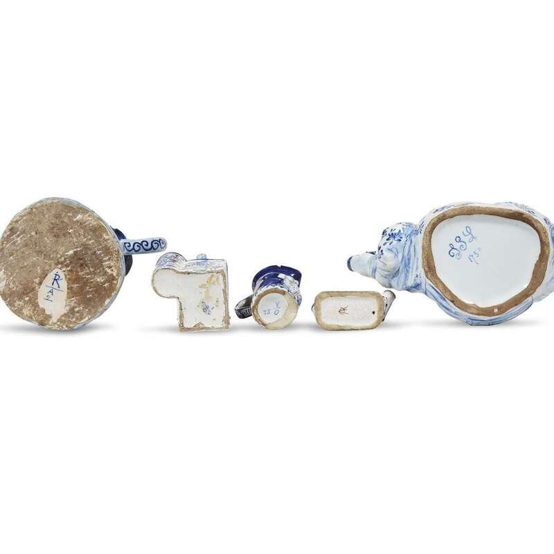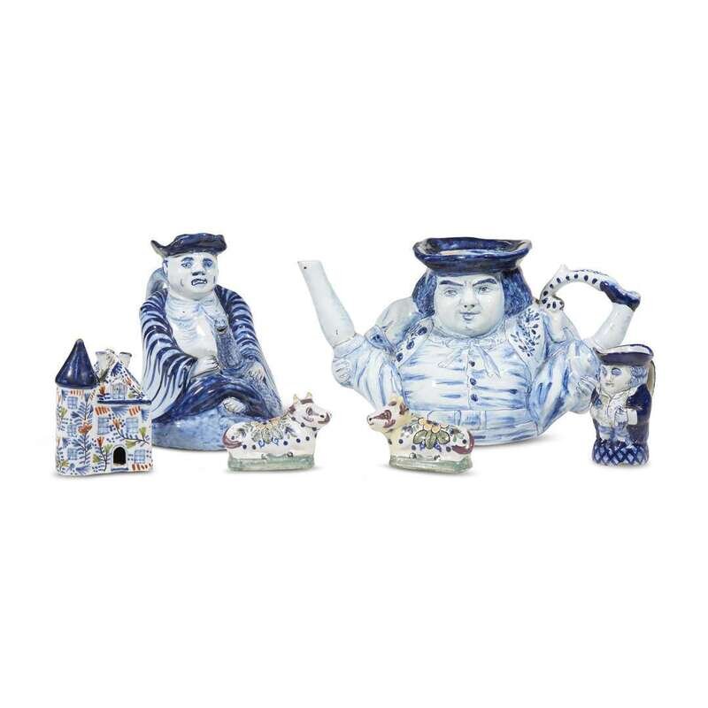 Comprising a pair of cows with marks probably for Adriaen Pynackder, De Twee Scheepjes; a polychrome decorated house-form pastille burner with unknown mark; a toby jug, unmarked; a figural candlestick with mark possibly of Augustyn Reygens, proprietor of the Golden Boot from 1663-1666; and a toby teapot marked and dated "JSL 1750". (6).