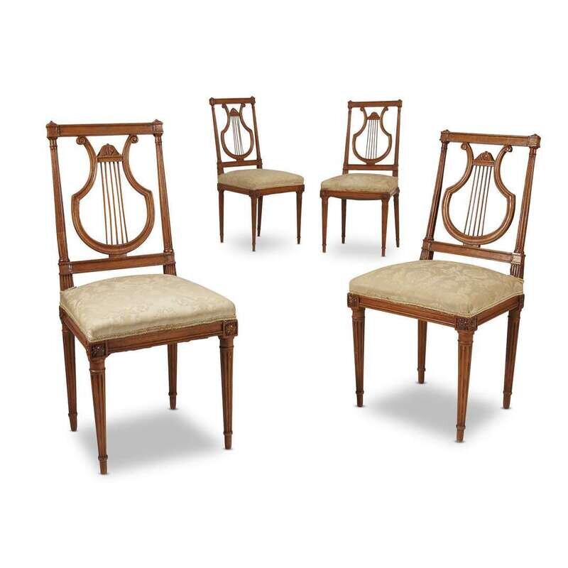 Four Directoire carved fruitwood lyre-back side chairs late 18th century