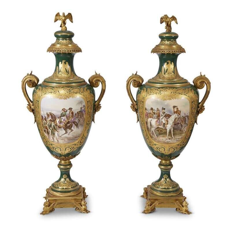 Baluster form with forest green ground, with removable covers surmounted by eagle-form finials; the first painted after Antoine-Jean Gros (French, 1771-1835), 'Avant la Bataille! Matinée des Pyramides' to recto and with a scene of Napoleon among the Pyramids to verso; the second depicting 'Après le Combat! Soirée d'Austerlitz' to recto, with a scene of soldiers marching to battle to verso; each indistinctly signed and with pseudo-Sèvres mark to underside of lids. (2).