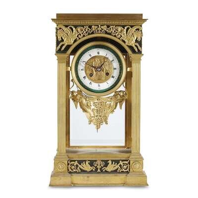 The rectangular moulded top above spandrels decorated with pegasus appliques and the sides with anthemia and putti, all suspended by fluted pilasters; the gilt-bronze and white and green enamel dial with Breguet hands and Roman numerals further suspending a pair of trumpeting Victoires; the whole above rectangular base with applied gryphon frieze; the movement stamped with Vincenti 'Medaille d'Or' pastille.