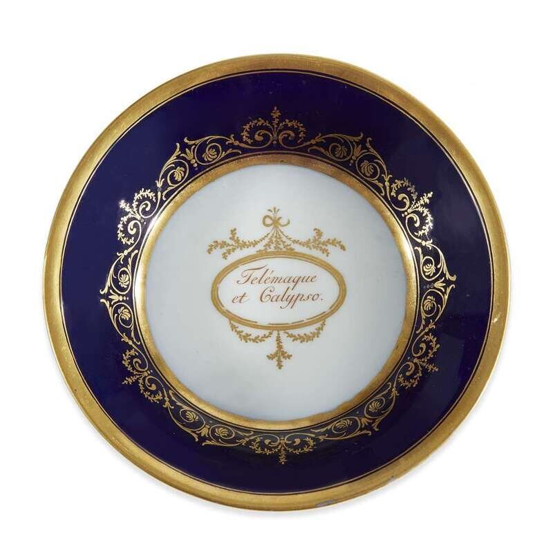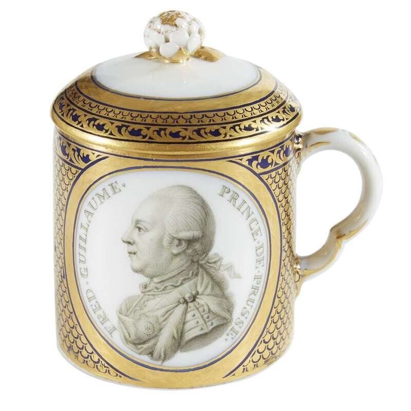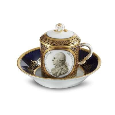 With parcel-gilt imbricated cobalt ground, the first cup with a classical portrait of Frederick II en grisaille, with conforming saucer decorated with a wreathed medallion and initials "FR" for "Fridericus Rex;" the second a cup and cover of similar design, with portrait of Frederick Wilhelm II, inscribed "Fred. Guillaume/Prince de Prusse," to recto and with allegories of victory to verso, sold together with an associated saucer inscribed "Telémanque et Calypso;" all with blue underglaze scepter mark to underside. (4).