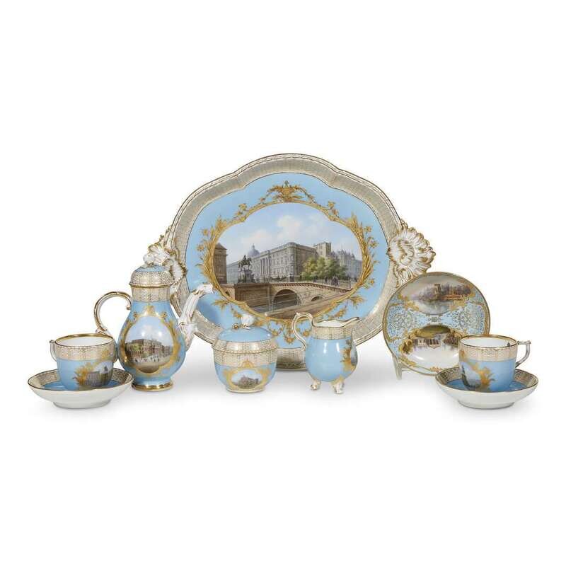 With bleu celeste ground and parcel-gilt rusticated border, comprising a coffeepot, covered sugar, creamer, two tea cups and saucers, and tray; sold together with a similar but earlier saucer with views of Kavalierhaus, Salzburg and Charlottenhof Palace, Potsdam; all with blue scepter mark and red imperial orb marks to underside. (9).