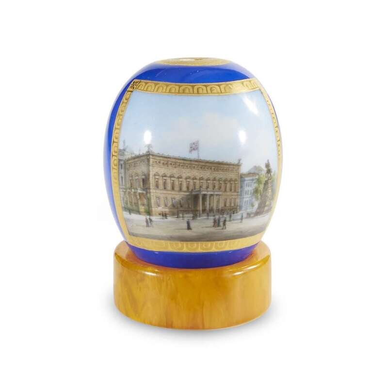 A K.P.M. hand-painted and parcel gilt porcelain egg with view of Berlin 1883