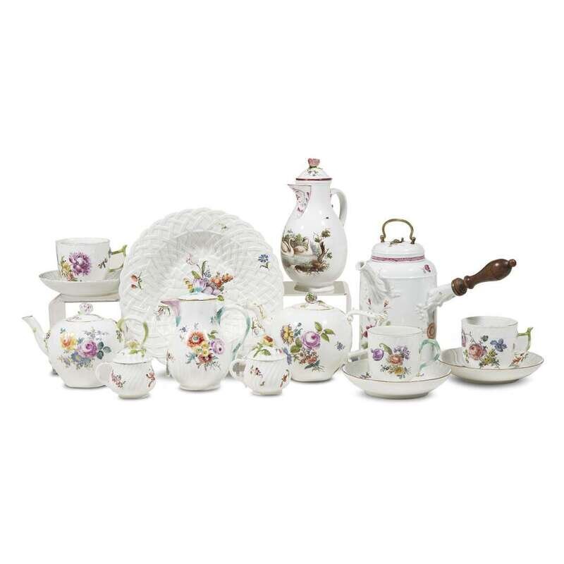 Comprising a Meissen chocolate pot, 18th century; a Meissen spiral-fluted part tea and coffee service comprising teapot, coffeepot, and three cups and saucers, 19th century; a Meissen teapot, 19th century; a Höscht coffeepot painted with swans and insects, 18th century; two Royal Vienna style spiral-fluted cups, one with cover, 19th century; and a Nymphenburg basket-moulded plate, 19th century. (14).
