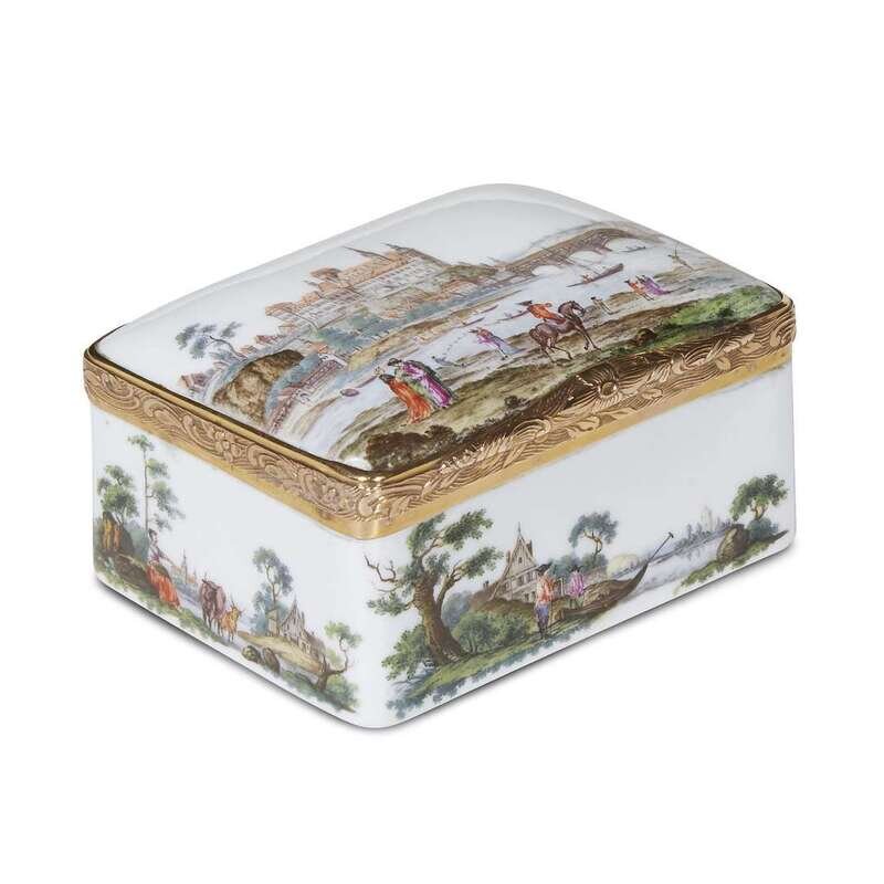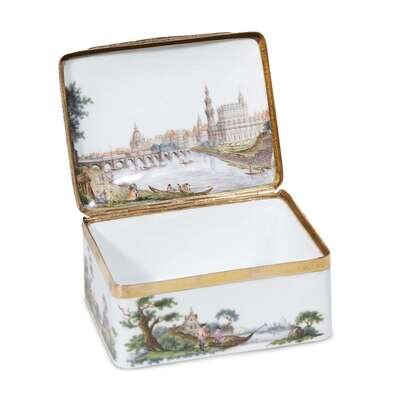 The top and interior of the lid finely painted with views of Dresden, the sides painted with pastoral scenes, and the underside painted with a picturesque ruin; apparently unmarked.
