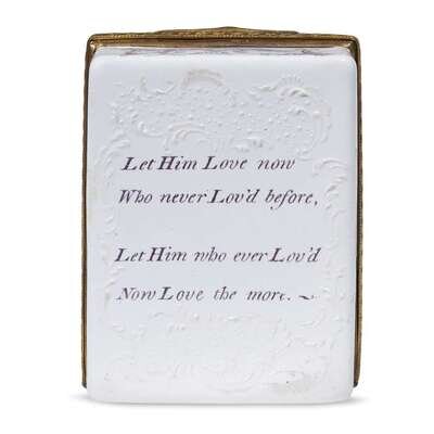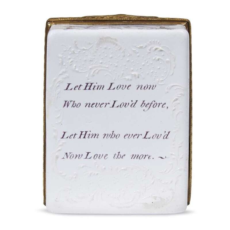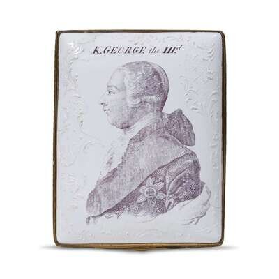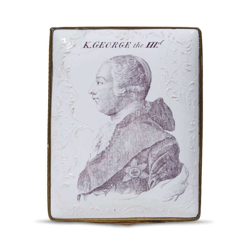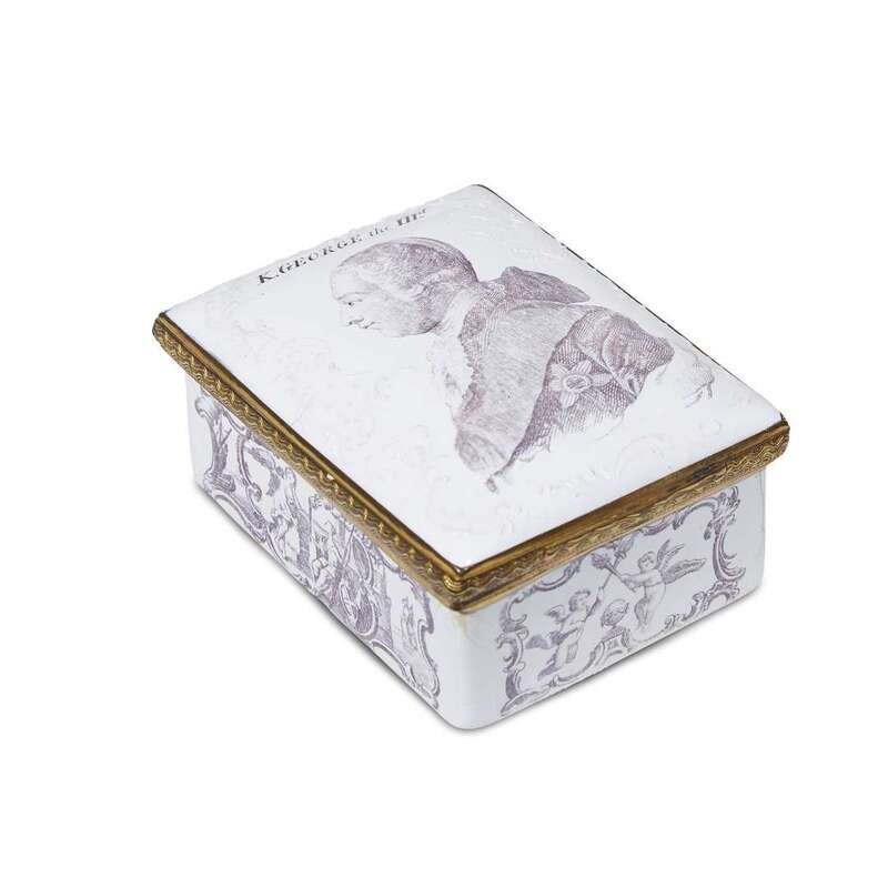 The top and underside decorated with raised rococo cartouches with diapered ground, the lid with portrait of King George III and the underside of the lid with portrait of Queen Charlotte; the sides decorated with allegories of England's virtues; the underside with inscription "Let Him Love now Who never Lov'd before, Let Him who ever Lov'd Now Love the more."