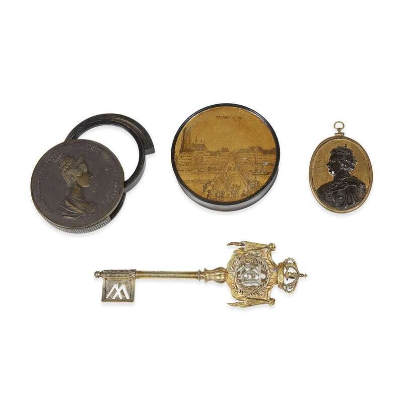 Comprising a gilt-bronze Prussian Chamberlain's key monogrammed "TA" beneath a crown; a parcel-gilt bronze hinged magnifying glass with portrait of Maria Anna, Empress of Austria and Queen of Hungary; a gilt tortoiseshell cameo portrait of Anne, Queen of England; and a gilt lacquer box with view of Frankfurt. (4).