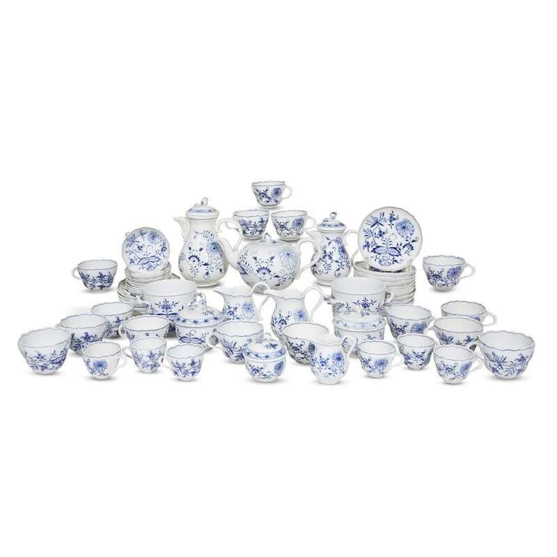 Comprising one four-piece tea service of teapot, covered sugar, creamer, and waste bowl; one four-piece coffee service of coffeepot, covered sugar, creamer, and waste bowl; one three-piece demitasse set of coffeepot, covered sugar, and creamer; 15 cups and 16 saucers; and six demitasse cups and nine saucers; all with blue underglaze crossed swords mark. (approx. 57).