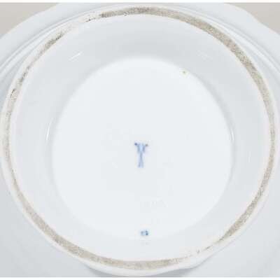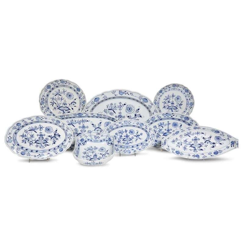 Comprising a large meat platter, three graduated oval platters, a salmon platter and strainer, two graduated circular serving dishes, a square serving bowl, and a boat-form loaf dish; all with blue underglaze crossed swords mark and some with incised/impressed marks. (10).