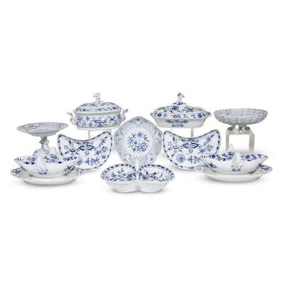 Comprising two sauce boats with integral trays, two crescent-form sweetmeat dishes, one covered vegetable dish, one game pie dish, one reticulated cake stand, one reticulated footed basket, and one reticulated dish, all with blue underglaze crossed swords mark and some with impressed marks; sold together with a 'Blue Onion' style handled sweetmeat dish of another manufacture. (18).