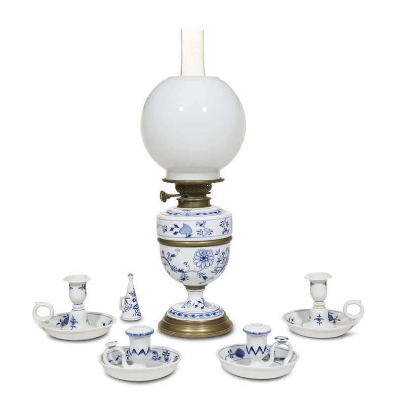 A assembled group of Meissen 'Blue Onion' porcelain lighting implements 19th and 20th centuries