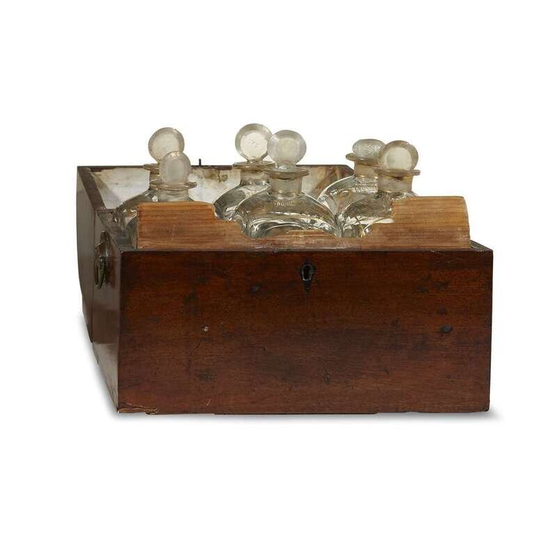 A George III mahogany and parcel-gilt glass decanter set circa 1790