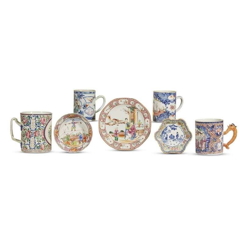Comprising four mugs, a plate, and two sweetmeat dishes. (7).