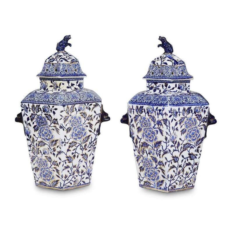 A pair of English blue and white hexagonal potpourri vases and covers possibly Staffordshire, first half 19th century