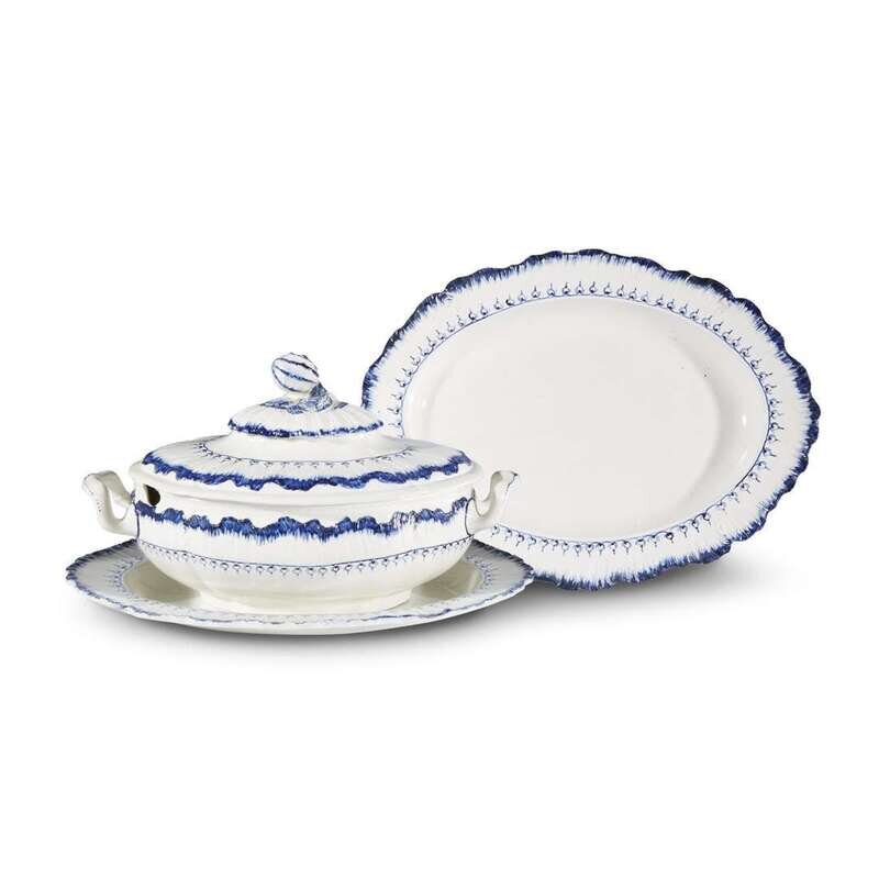 Comprising a covered tureen and two oval platters, with impressed mark and worker's marks. (3).