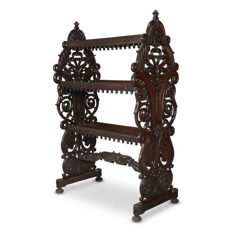 With three shelves suspended between two boldly foliate-carved supports united at base by an acanthus-carved stretcher.