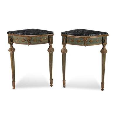 A pair of Italian Neoclassical parcel-gilt and green painted corner tables circa 1800