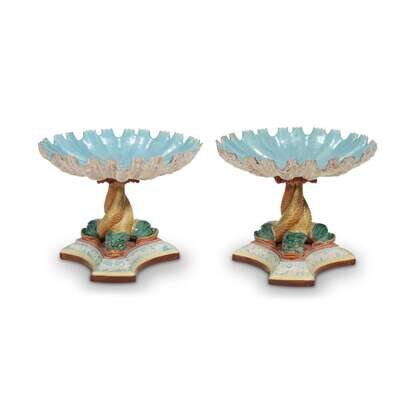 A pair of Royal Worcester majolica dolphin-footed compotes circa 1870s