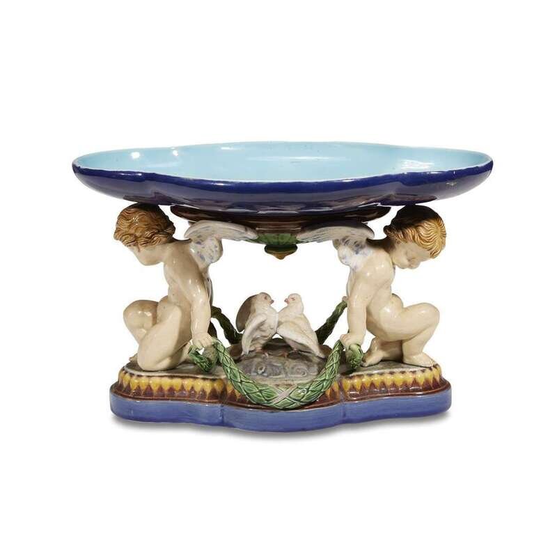 The quatrefoil serving well supported by two putti holding laurel swags and guarding two courting doves; with impressed Minton mark and date code for 1868 to underside.