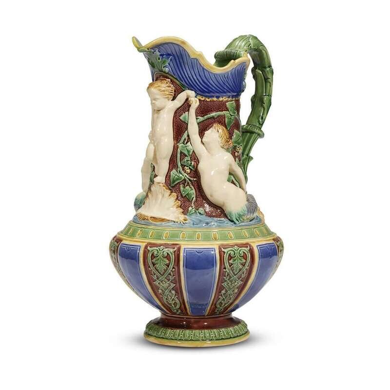 The body decorated with modeled putti and mermaids, the handle in the form of an ivy branch with masque at the termination; with impressed "Minton" mark and date code for 1864 to underside.