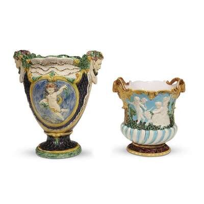 Comprising a larger urn, apparently unmarked, and smaller Minton urn, with impressed "Minton" mark and date code for 1865. (2).