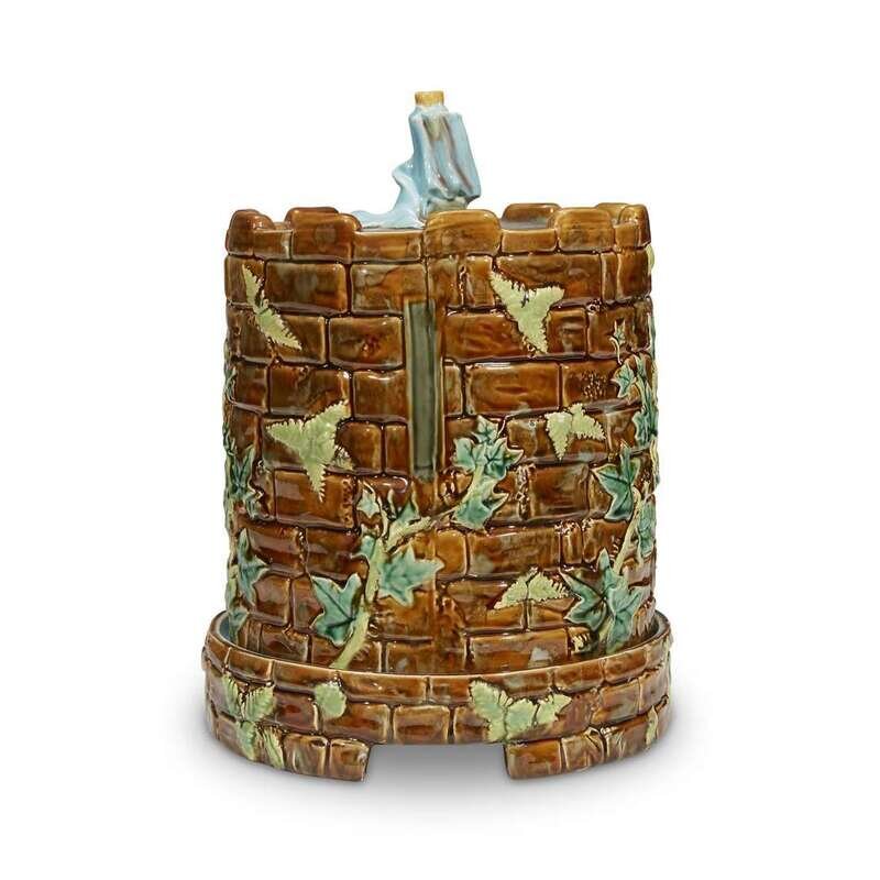 A George Jones majolica stilton cheese stand and cover in the form of an ivy-covered castle tower circa 1875