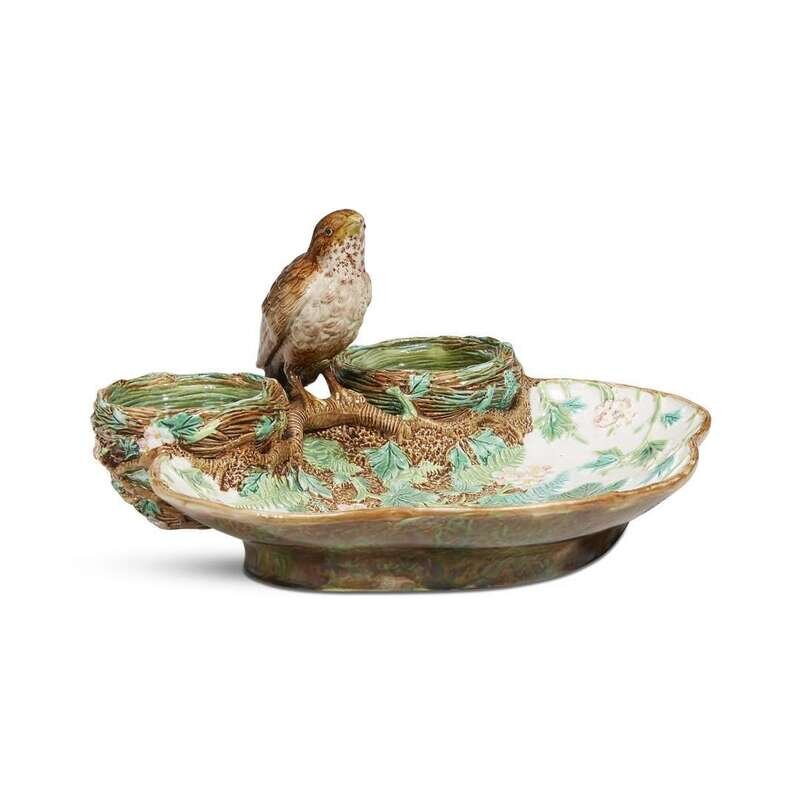 The central well with floral motifs, the nest-form condiment dishes flanking a modeled bird; with impressed registry mark to reverse.
